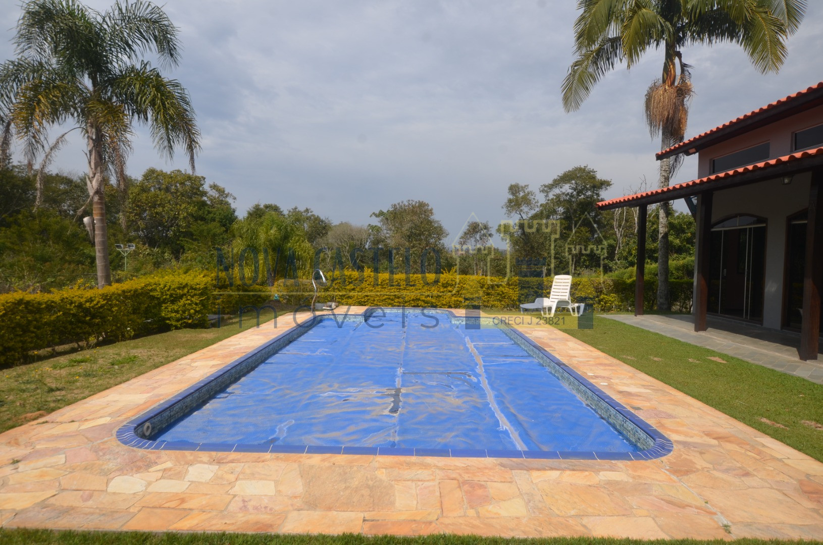• Piscina em vinil 4x8 com belo deck em pedra mineira, cascata, prainha, ducha e iluminação de led