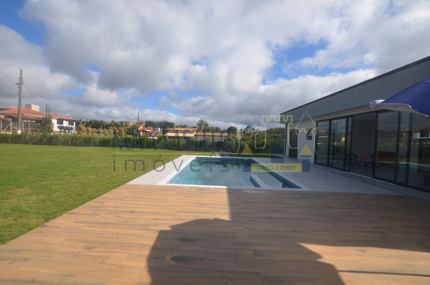 Piscina de 4x8m iluminada, com amplo deck e ducha